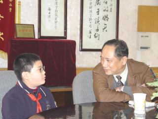 来到三楼的会议室,潘校长和几位年会负责老师早已坐在座位上向王伯伯汇报康宁几个月以来做的工作及各个研究所为年会的筹备工作,但似乎也正等着我们几位记者的采访。与王伯伯的沟通开始了。刚提到九月份的康宁与现在的不同点,王伯伯开玩笑地告诉我们,开学初没见到我们这些小记者,今天总算认识了,也可以说成为了好朋友了吧!过了一会儿,我们请求王伯伯为我校题词时,他却笑着拒绝了,还说什么不满60岁的领导或老师不许在外面题词。而机灵的马天慧灵机一动,盯着王伯伯的“王伯伯的忘年之交”央求他题词,并忙活了一阵子,准备好了毛笔、宣纸等题词工具,可王伯伯见自己如此难堪,只好给我们一句话:“少年有为,志存高远!”这句话可以说是意味深长啊!