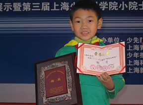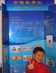 | 我叫占毅鸣,在康宁科技实验小学上三年级。2005年3月我的项目《利用牵引设施进行隧道内抛锚车辆排堵的研究》获第二十届英特尔上海市青少年科技创新大赛创造发明二等奖。在业余时间,我喜欢踢足球、拉小提琴、看书、上网查资料和玩游戏。 我的座右铭是“世上无难事,只要肯登攀”。我的志愿是创新发明,争当一名科学小院士。 2005年8月29日(光明日报)文章《他们在台湾成为“小明星”—记“宋庆龄少年儿童发明展”台湾行》中对占毅鸣进行了相关报道并刊登了占毅鸣的照片。创新项目“方便鞋带”在台北获得好评。10月该项目在英特尔上海市青少年科技创新月活动中被评为“优秀项目”并被上海科协英才俱乐部招收为最小的会员。 |