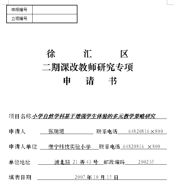 徐汇区二期课改教师研究专项申请书(自然)